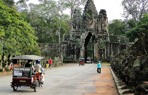 Angkor by Tuk Tuk 2 Your own Tuk Tuk and guide wait for you in the early morning at your booked hotel in Siem Reap and head to the main gate of the Angkor temples and make your early morning stop to see the sunrise. Arguably the largest religious building in the world, with a volume of stone equaling that of the Cheops pyramid in Egypt; it is unlike all the other Khmer temples in that it faces west. Its symmetrical towers are stylized on the modern Cambodian flag. Conceived by Suryavarman II, Angkor Wat took an estimated 30 years to build.