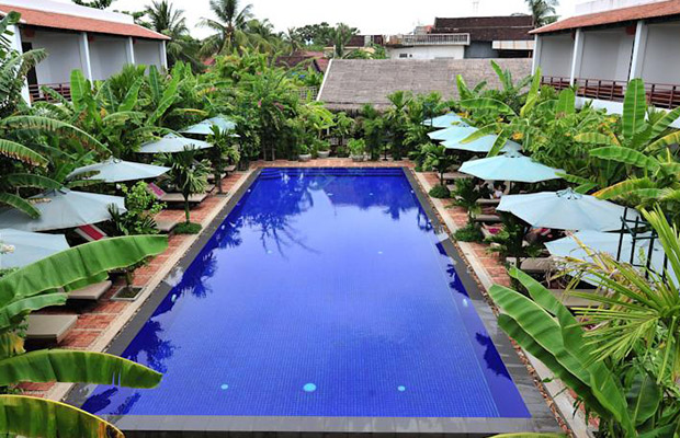 The hotel has an outdoor restaurant featuring traditional Cambodian cuisine and international dishes. The restaurant overlooks the garden and pool.